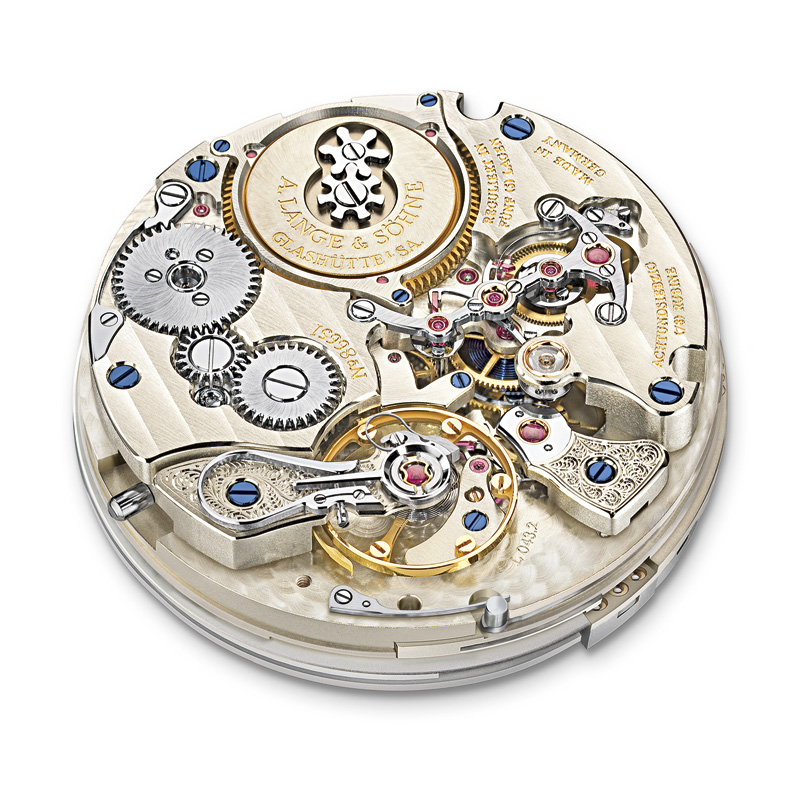 - Calibre de la manufactura de Lange L043.2, cuerda manual, fabricado según los más altos criterios de calidad de Lange, decorado y montado a mano; regulación de precisión en cinco posiciones; platina tres cuartos de alpaca natural; puente del volante grabado a mano; salto de los minutos; accionamiento constante por medio de un mecanismo de reajuste de la tensión