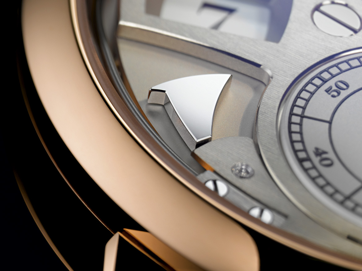 - Horas y minutos. Ambas en forma de indicación de las cifras saltantes, pequeño segundero con parada del segundero; indicación de la reserva de marcha, señal acústica para los cuartos y las horas completas