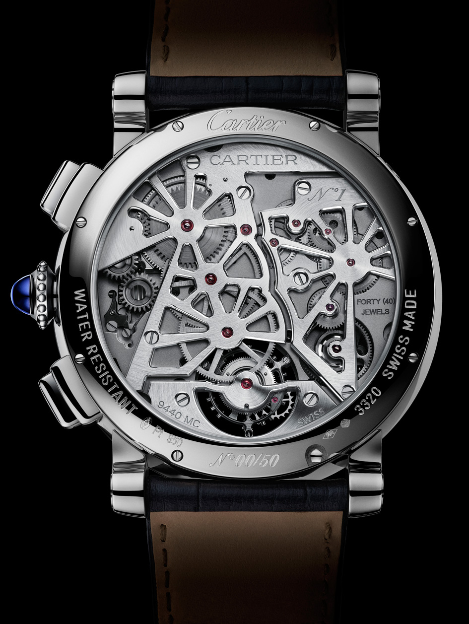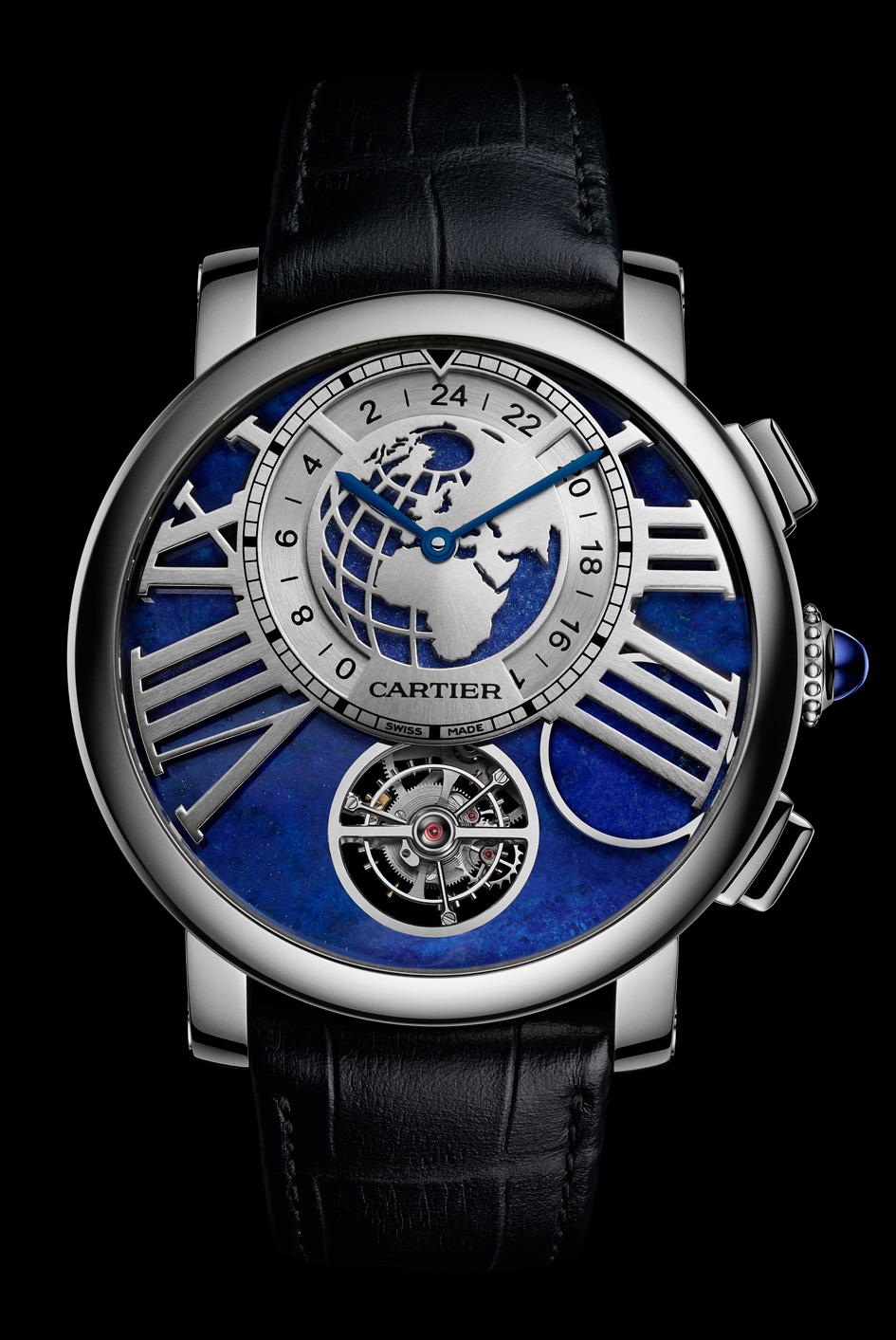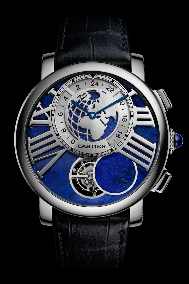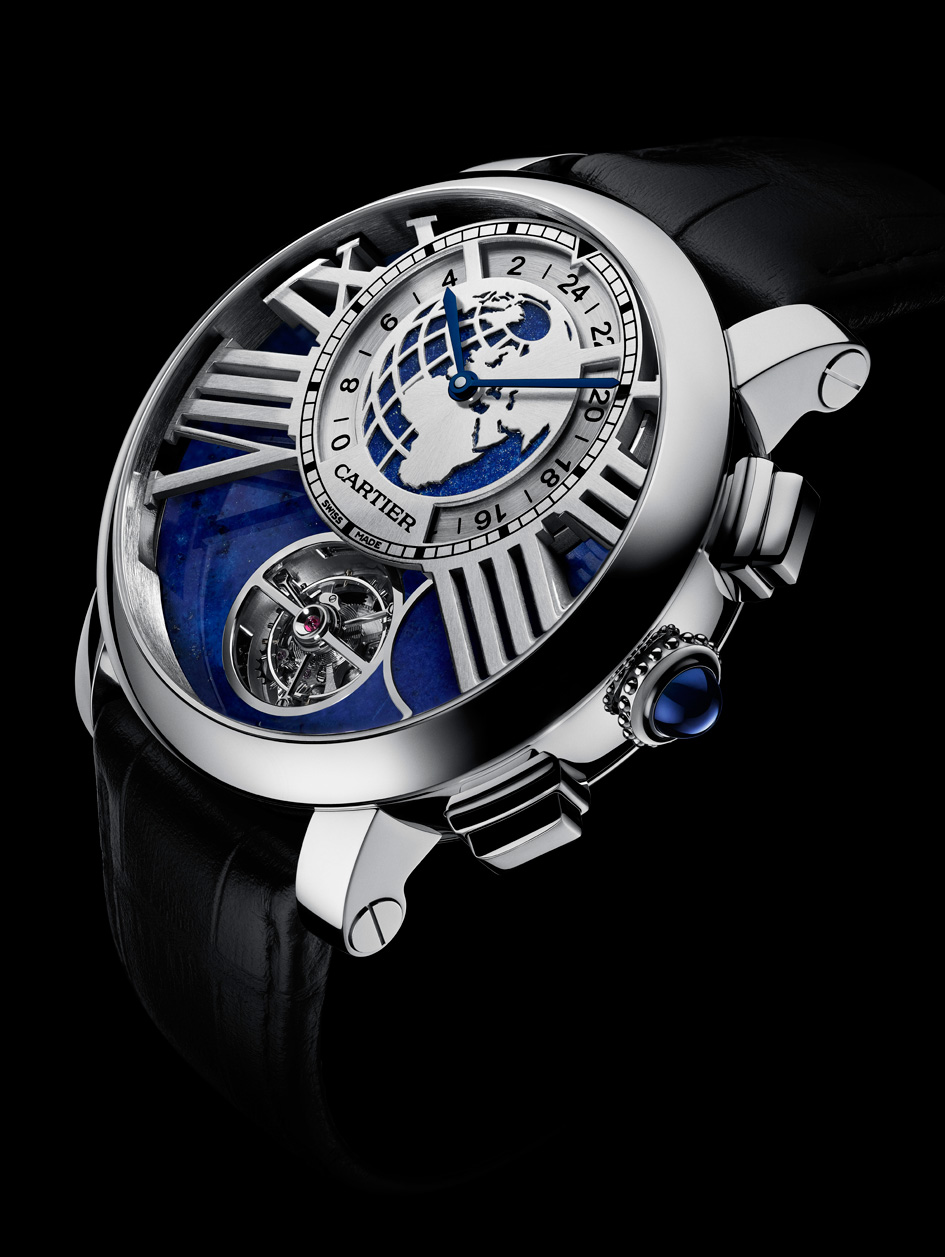 Caja: Platino Diámetro 47 mm, altura 16,65 mm Corona perlada en platino adornada con un cabujón de zafiro azul Cristal y fondo de zafiro Bisel de platino Esfera: Lapislázuli, rejilla en oro blanco de 18 quilates con forma de números romanos Manecillas de acero azulado en forma de espada Funciones: Horas, minutos, tourbillon, segundo huso horario y fase lunar a petición Movimiento: Calibre de manufactura 9440 MC manual 40 mm de