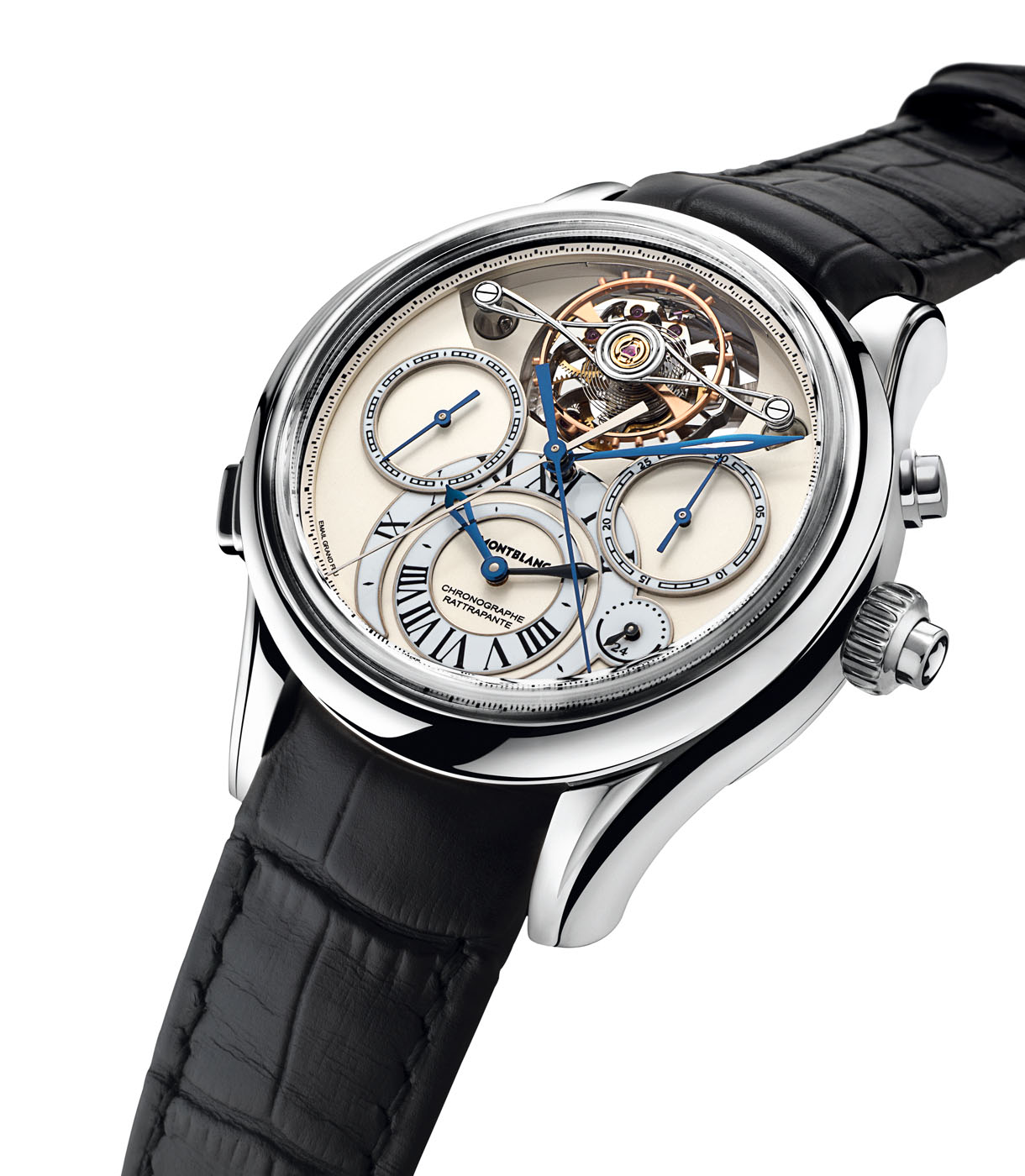 - Corona en oro blanco. Pulsador a las 2 para la función rattrapante. Pulsador a las 8 para la segunda zona horaria