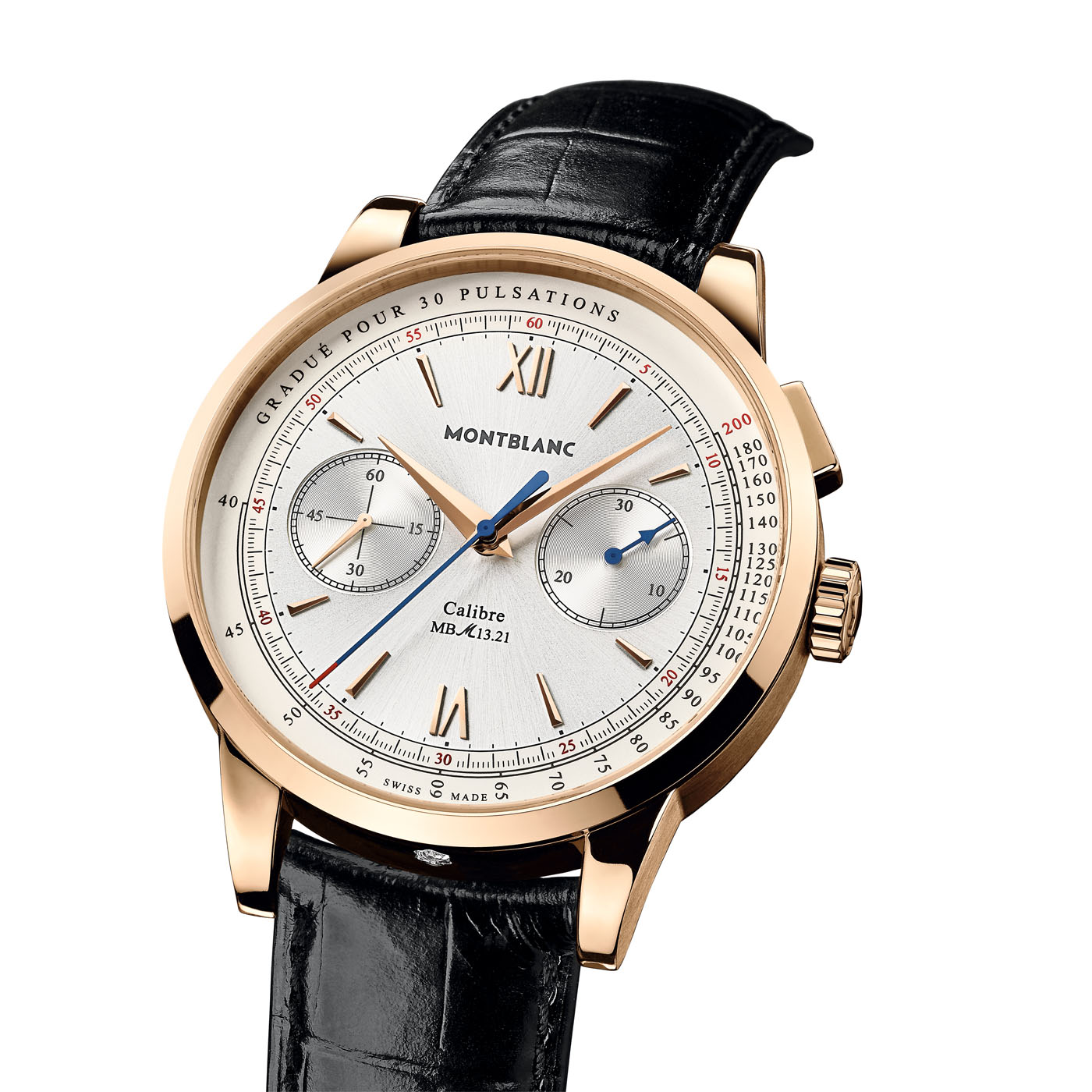 Caja: Oro rosa Diámetro 41 mm, altura 11,8 mm Bisel pulido Acabado satinado horizonal a mitad de la pieza Pulsador de cronógrafo a las 2 Diamante de 0,055 quilates con la forma del emblema de la casa a las 6 Corona de oro rosa con el emblema de Montblanc en relieve Cristal curvado antirayaduras y antireflejos Fondo de oro rosa con cristal de zafiro Hermético
