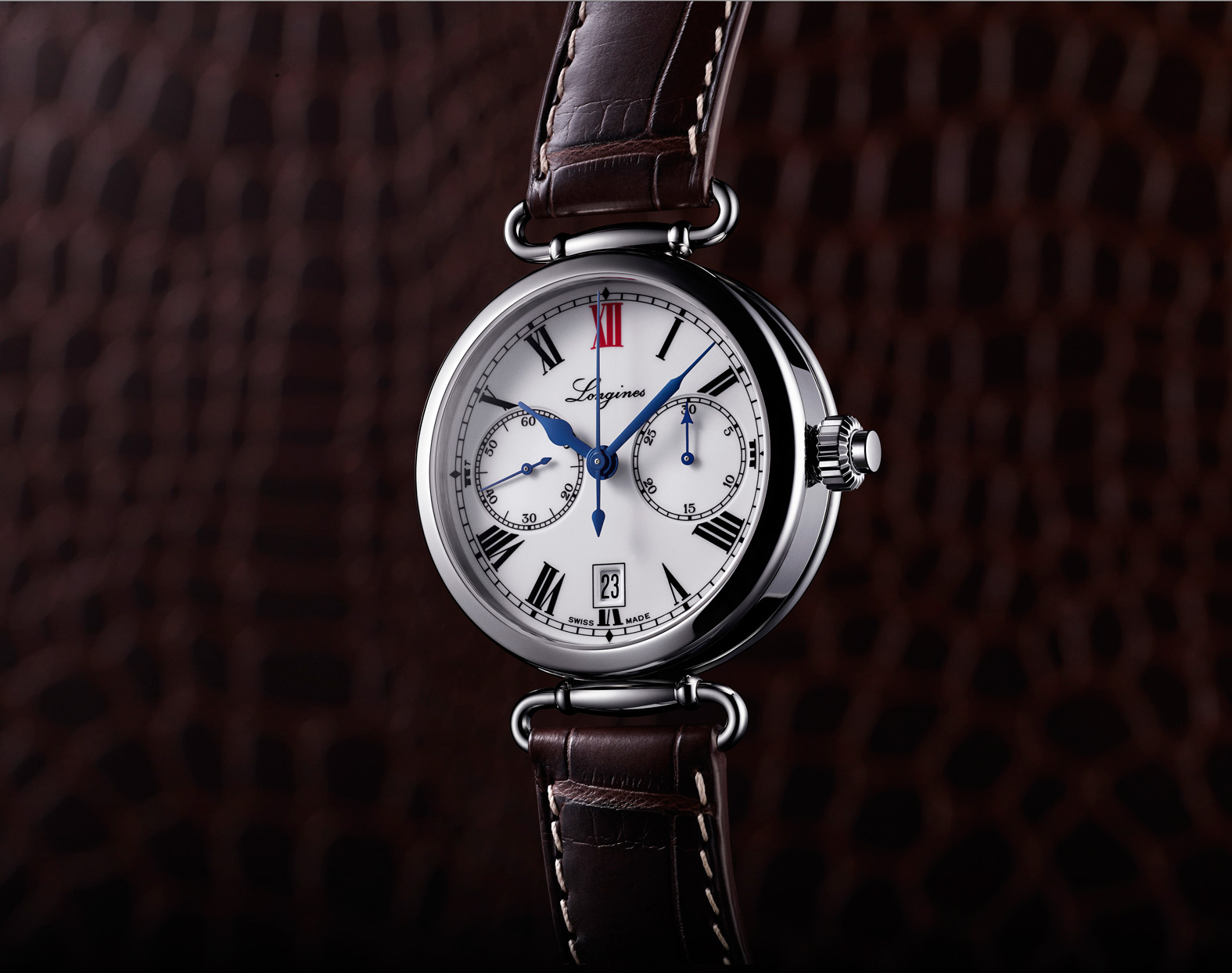 Versión L2.776.4.21.3 con asas móviles. Esfera con numerales romanos. XII en rojo