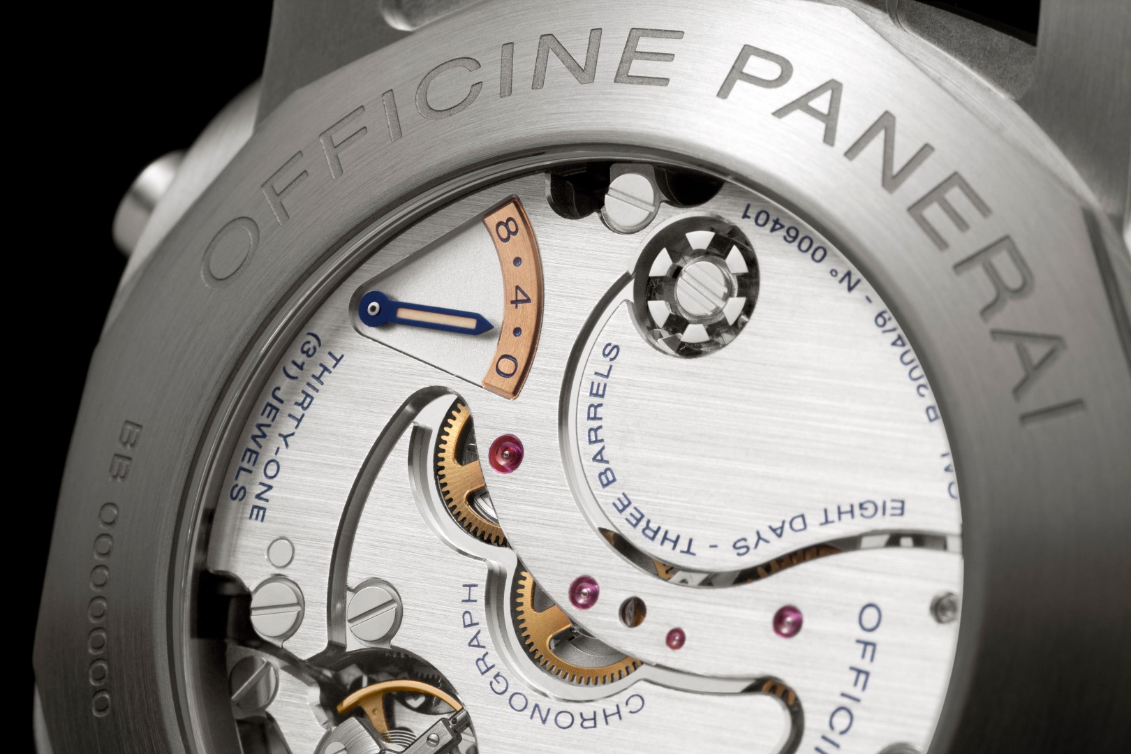 - Calibre exclusivo Panerai P.2000/9 mecánico de cuerda manual