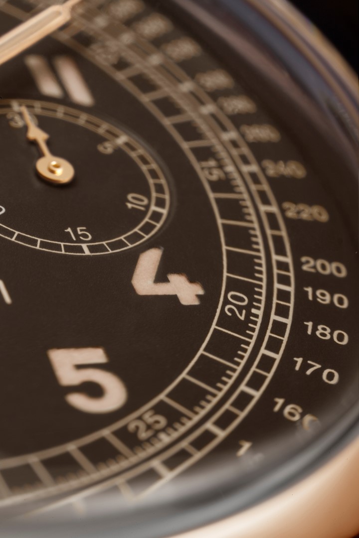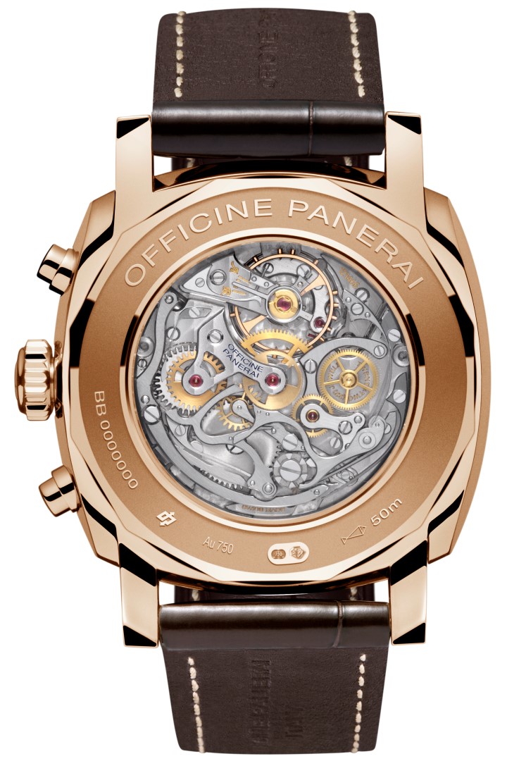 Caja: Oro rojo pulido de 18 quilates Diámetro 45 mm Cristal: Plexiglas®, 2,8 mm de grosor Corona atornillada con personalización OP Pulsadores de oro rojo pulido para las funciones del cronógrafo a las 2h y a las 4h Bisel: oro rojo pulido Fondo: cristal de zafiro transparente Hermético hasta 50 metros Esfera: Marrón con números arábigos e índices horarios luminiscentes. Contador de minutos a las 3h, segundero