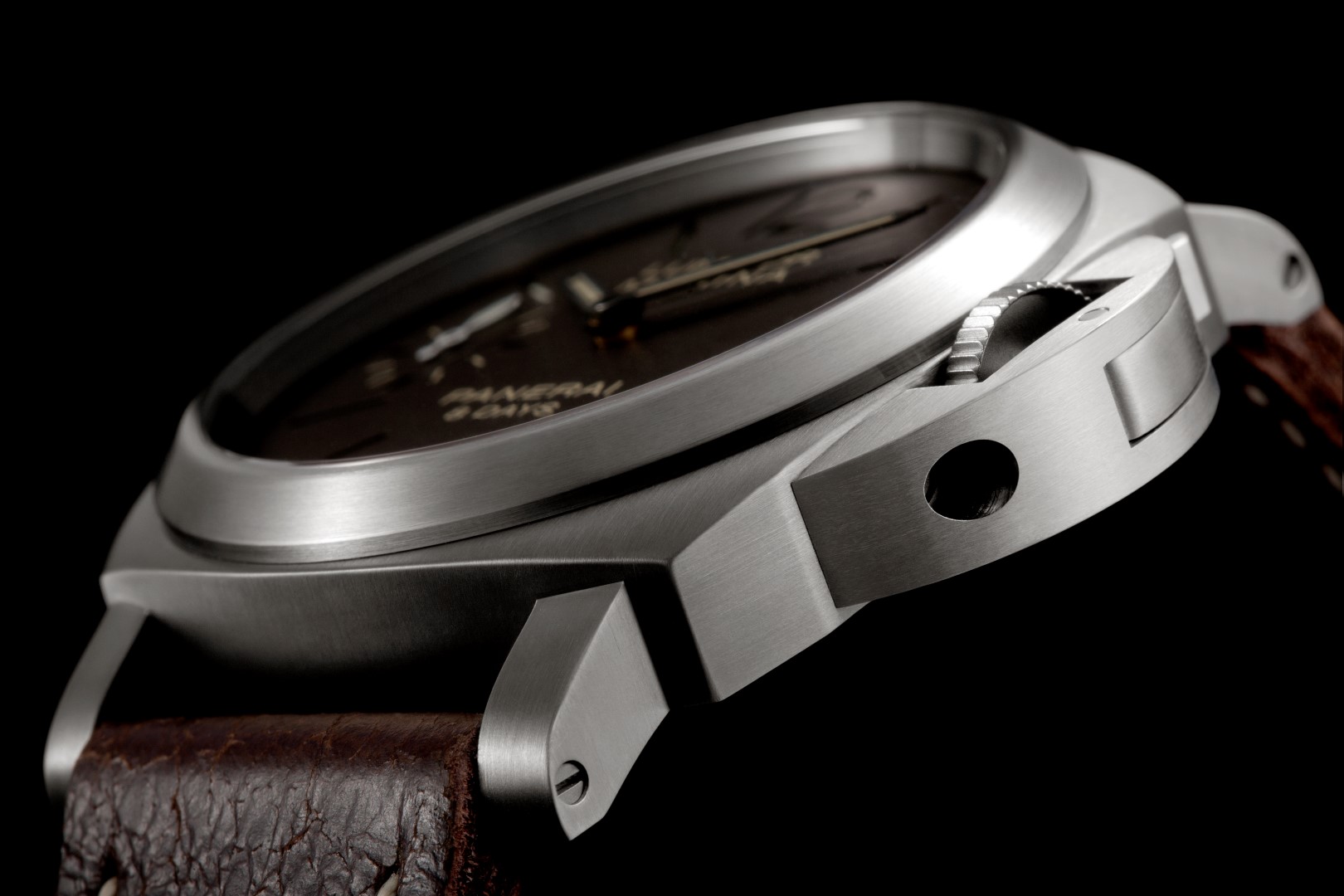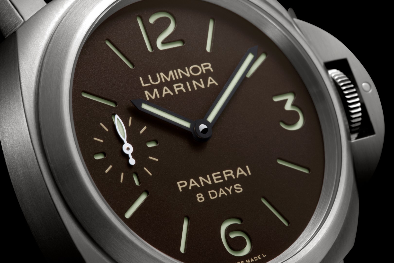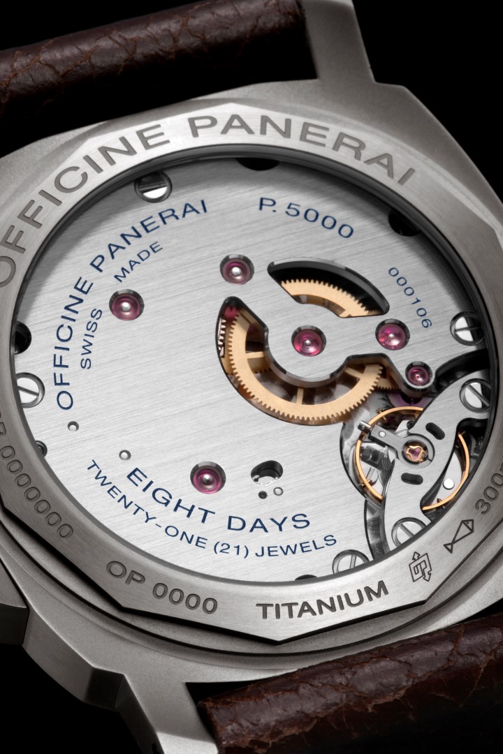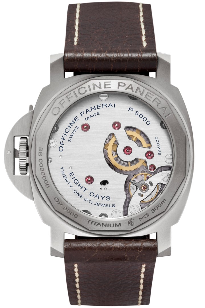 Caja: Titanio satinado Diámetro 44 mm Cristal: zafiro a base de corindón, de 2,5 mm de espesor. Revestimiento antirreflejante Dispositivo protector de la corona: (marca registrada) de titanio satinado Bisel: titanio atinado Fondo: cristal de zafiro transparente Hermético hasta 300 metros Esfera: Color marrón, con números arábigos e índices horarios luminiscentes Funciones: Horas y minutos. Pequeño segundero Movimiento: Calibre Panerai P.5000 mecánico de cuerda manual 15¾ líneas. Grosor de 4,5 mm 21 rubíes 127 componentes Volante