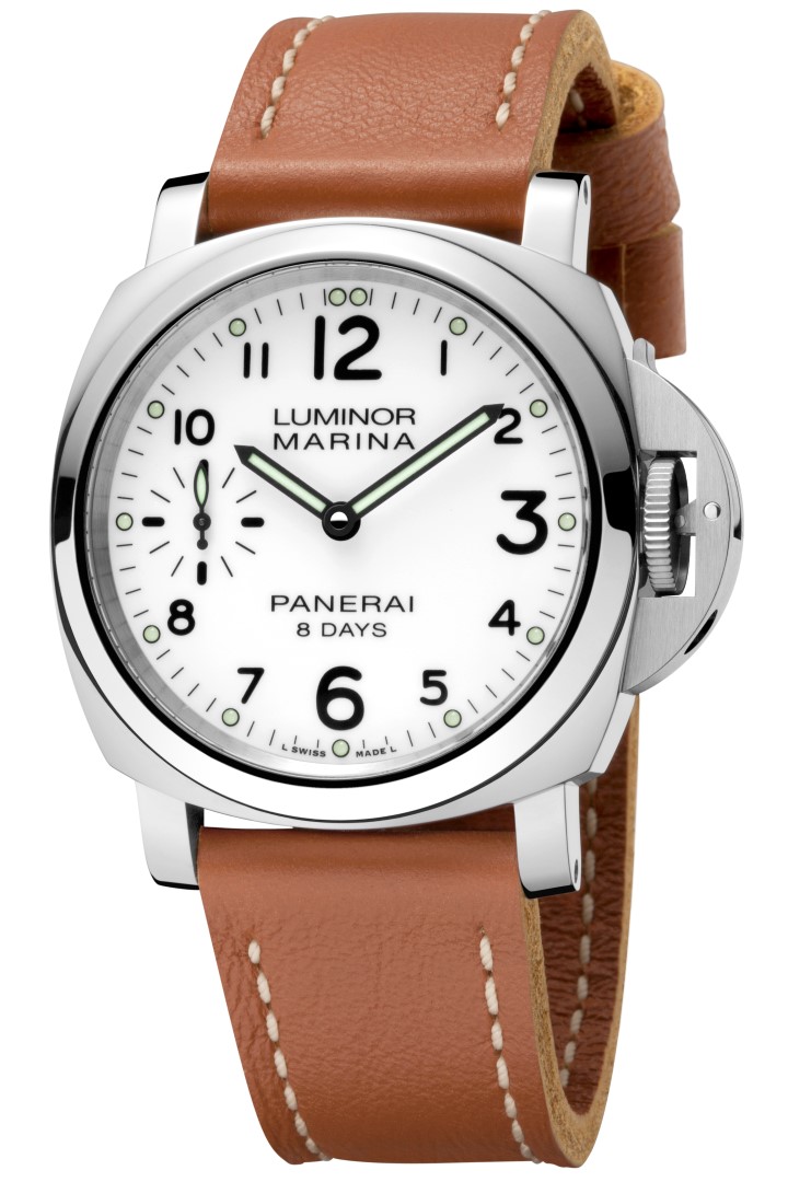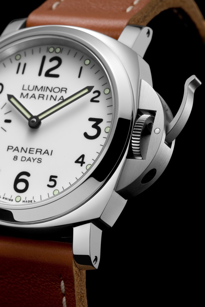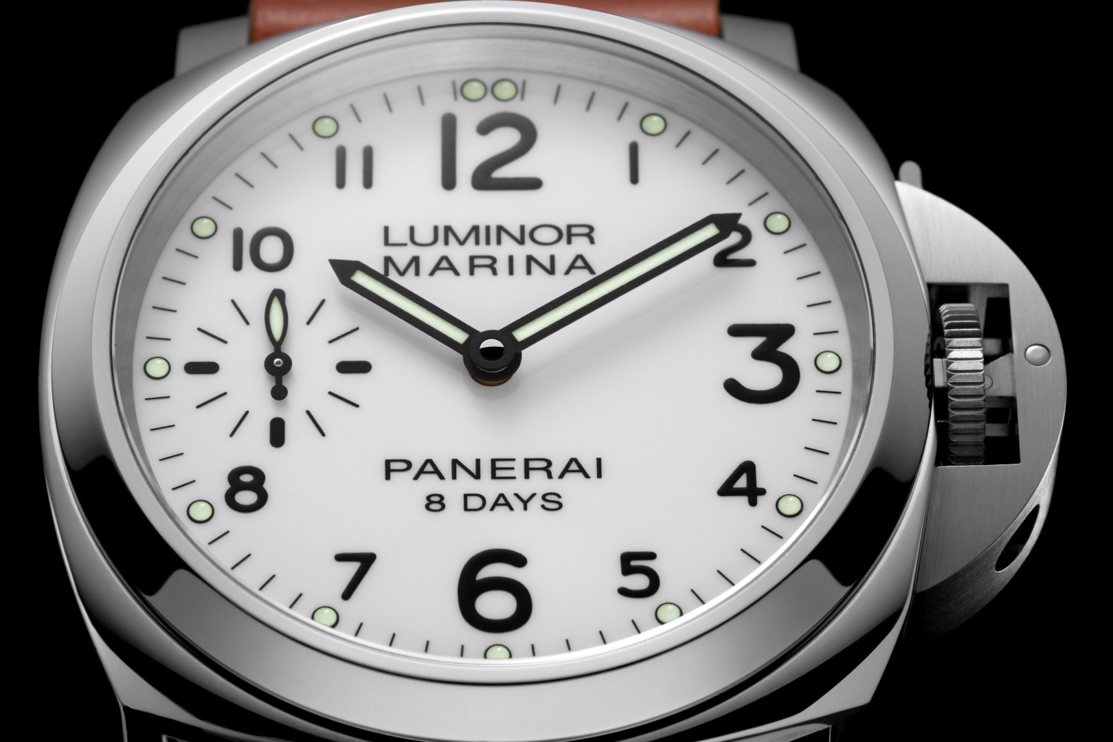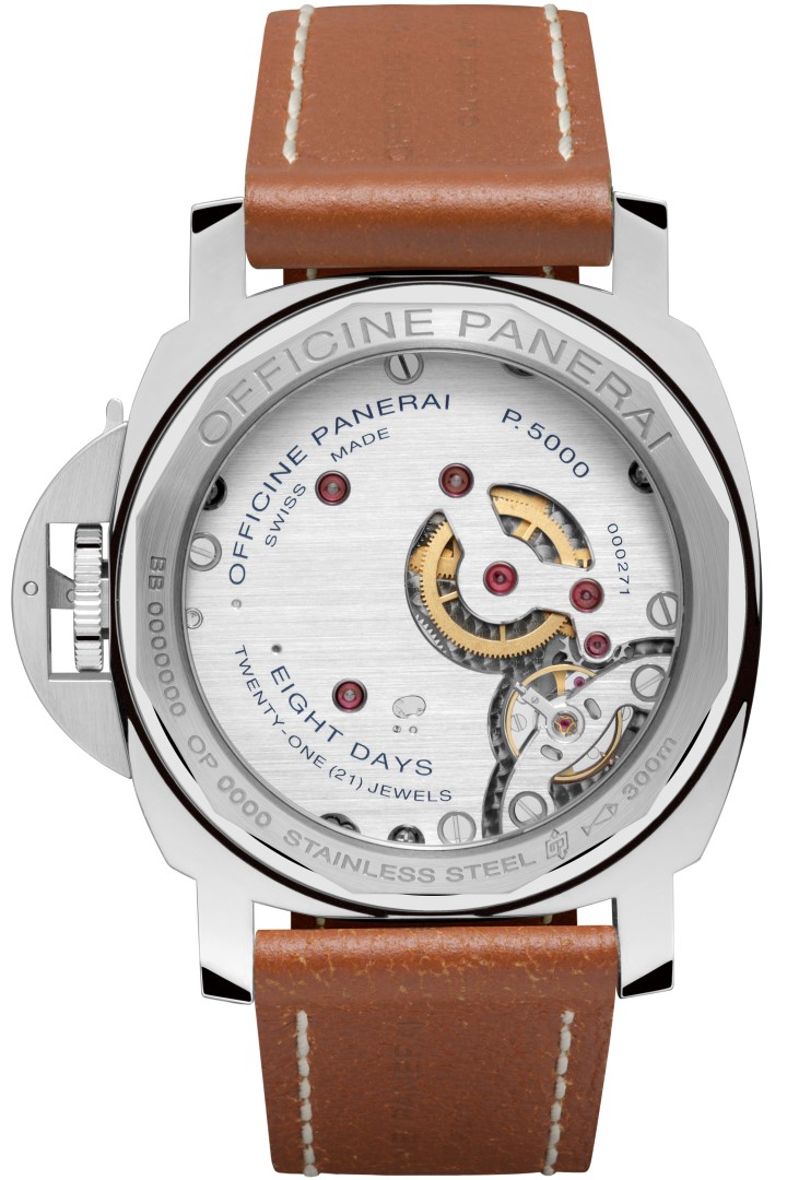 Caja: Acero pulido AISI 316L Diámetro 44 mm Cristal: zafiro a base de corindón, de 2,5 mm de espesor. Revestimiento antirreflejante Dispositivo protector de la corona: (marca registrada) de acero satinado Bisel: acero pulido Fondo: cristal de zafiro transparente Hermético hasta 300 metros Esfera: Color blanco, con números arábigos e índices horarios luminiscentes Funciones: Horas y minutos. Pequeño segundero Movimiento: Calibre Panerai P.5000 mecánico de cuerda manual 15¾ líneas. Grosor de 4,5 mm 21