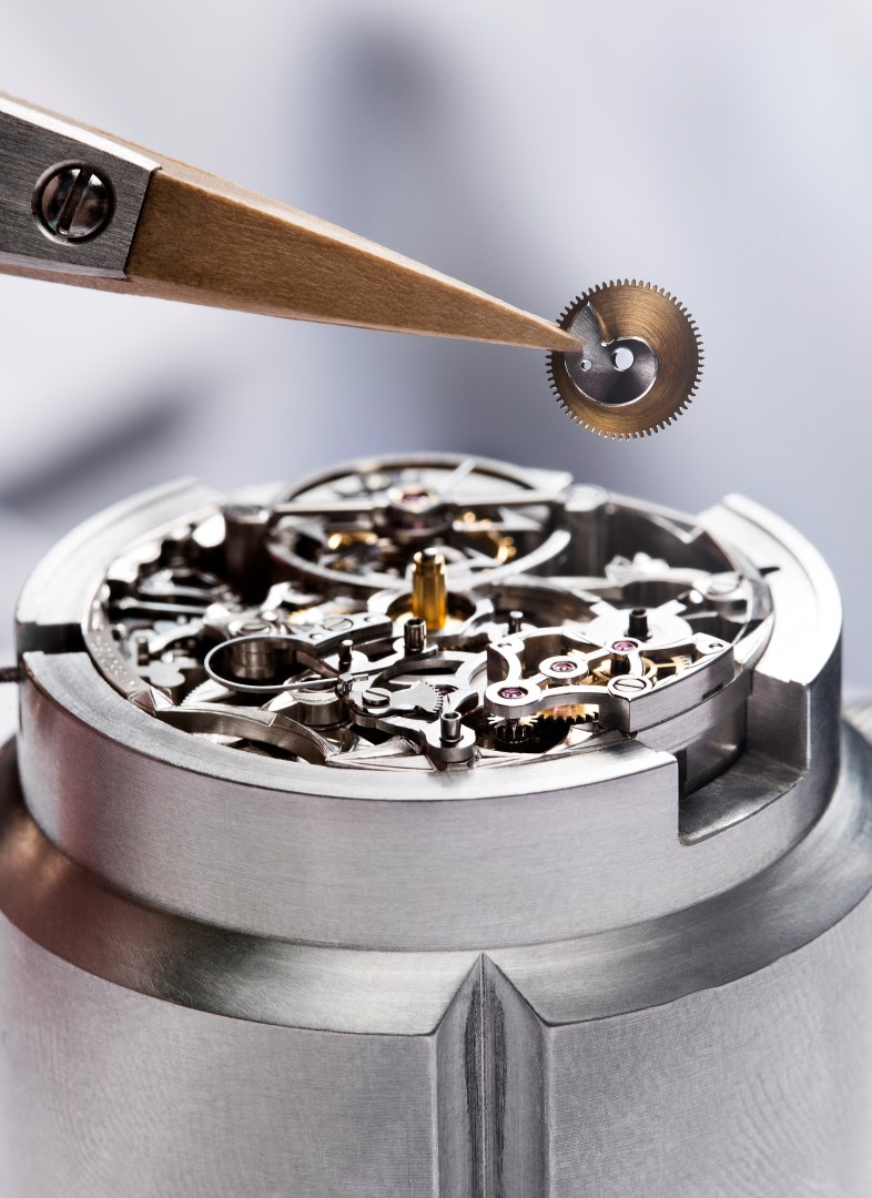 - Anillo exterior color pizarra con índices de oro blanco aplicado y minutero en blanco