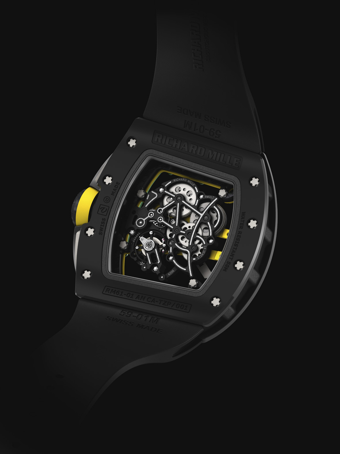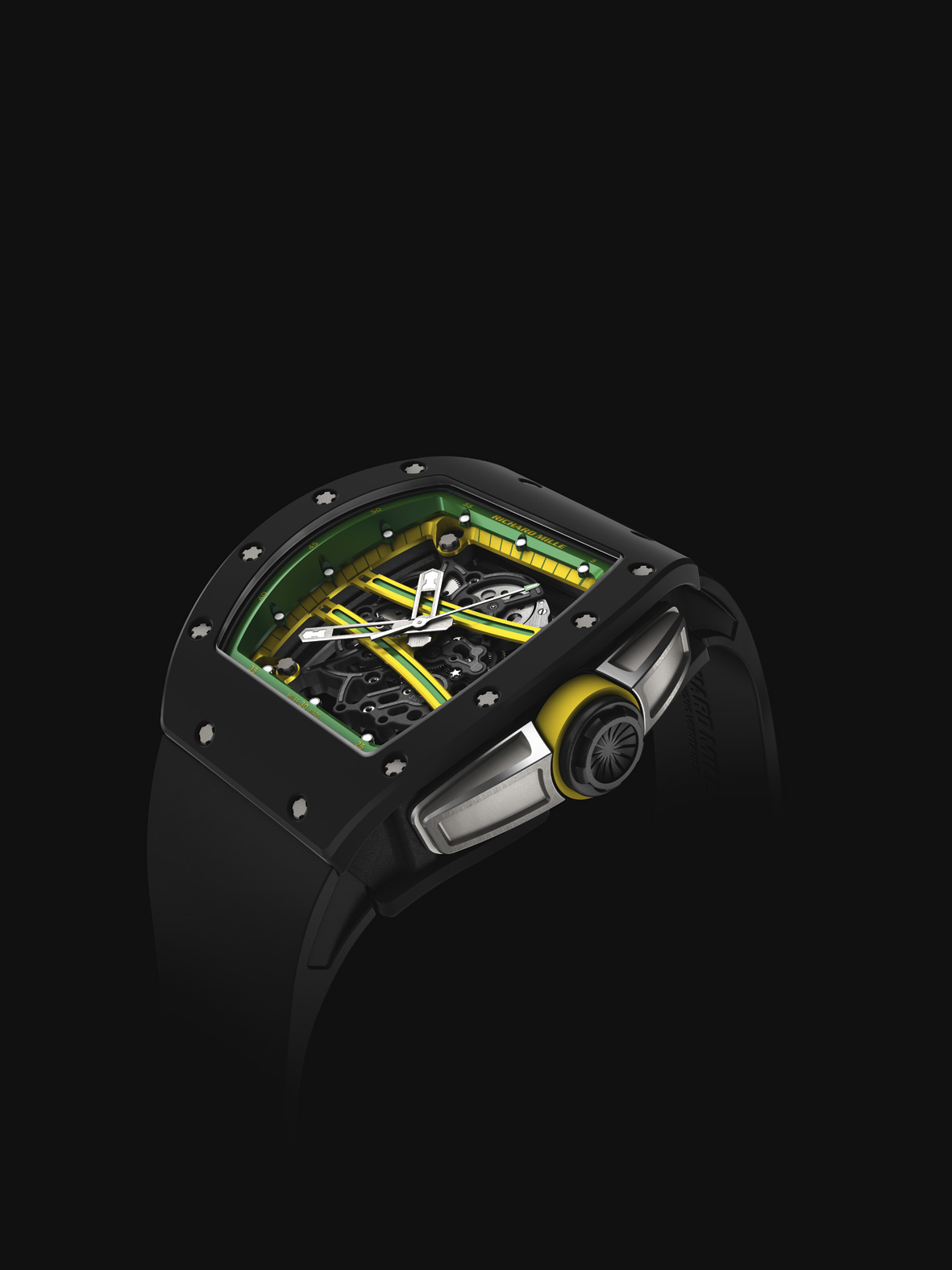 Caja: Carbono NTPT®. Bisel y fondo en cerámica negra TZP-N Diámetro 50,23 x 42.70 x 15,84 mm Cristal: zafiro (dureza 1 800 HV) con tratamiento antirreflejos (ambos lados). Grosor de 1,5 mm Corona de carbono NTPT® con junta exterior de Alcryn Realce superior de aluminio anodizado verde, con los índices de las horas rellenos de material luminiscente homologado. Realce de los minutos de titanio