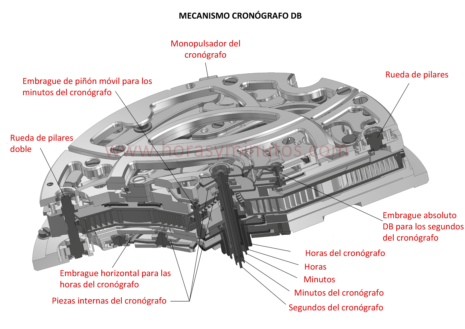 - Horas y minutos. Cronógrafo monopulsador con contadores de 24 horas, 60 minutos y 60 segundos. Tourbillon