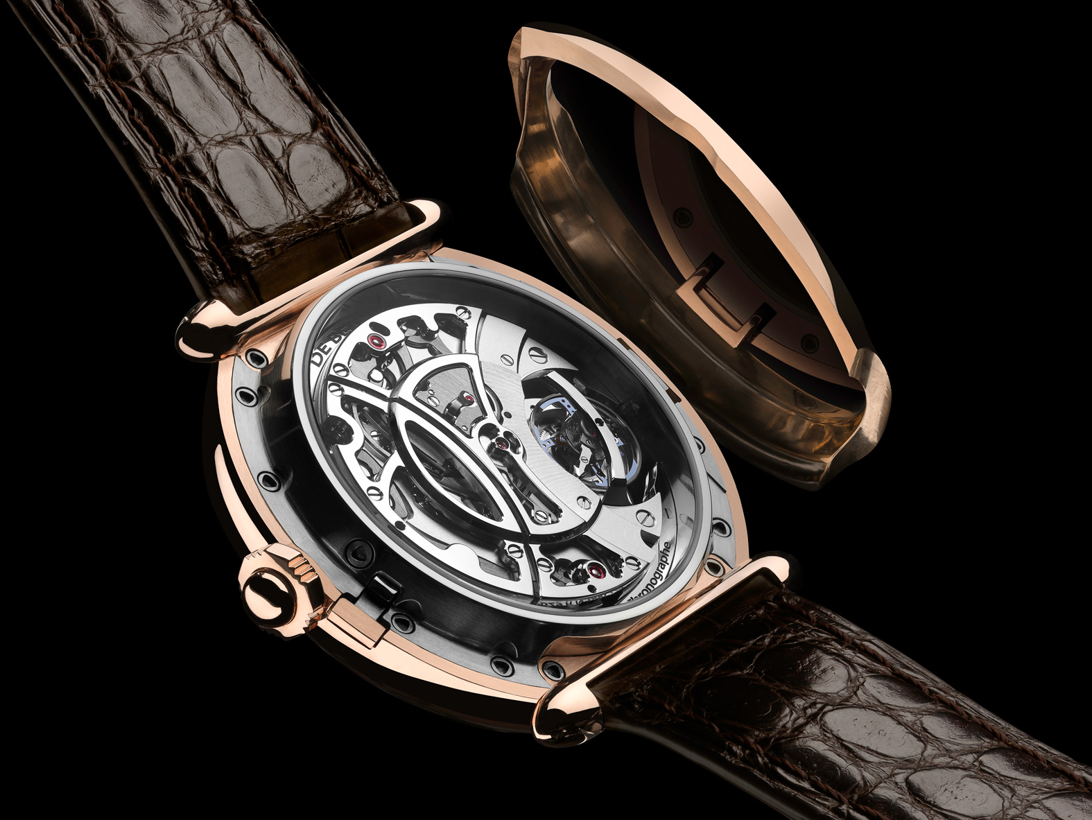 Caja: Oro rosa Diámetro 46 mm, altura 11,70 mm Cristal de zafiro con dureza 1.800 Vickers y doble tratamiento antireflejos Reverso de cristal de zafiro con dureza 1.800 Vickers y doble tratamiento antireflejos Tapa con bisagra invisible en oro rosa Esfera: Plateada. Construida en diversos niveles Contador interior central de 24 horas para el cronógrafo Contador