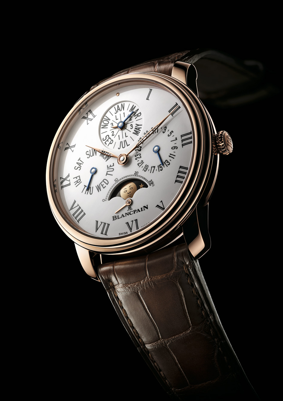 - Horas y minutos. Pequeño segundero. Calendario perpetuo. Fases lunares