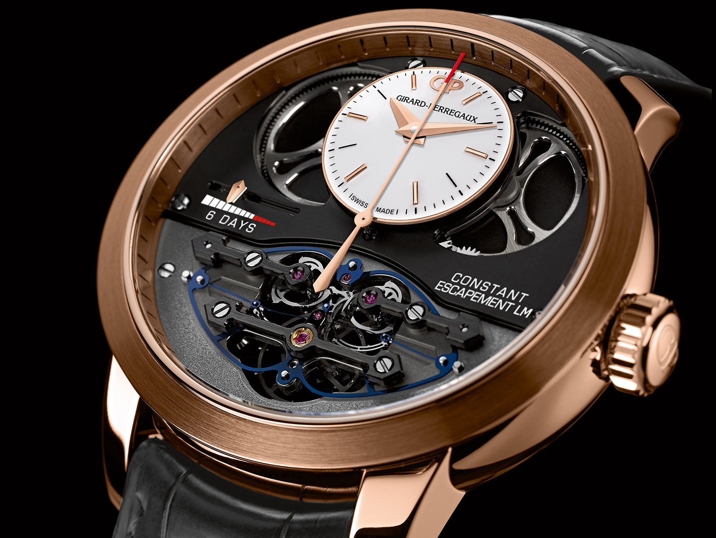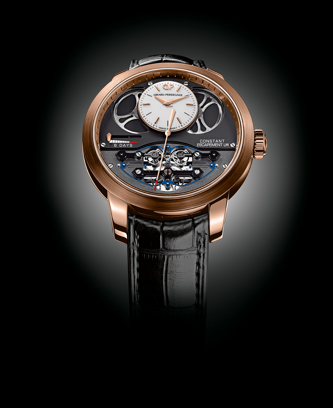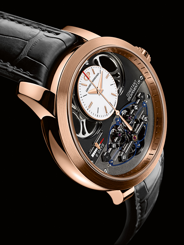 Caja: Oro rosa Diámetro: 48 mm Bisel: satinado circular, interior satinado Cristal: abombado con tratamiento antirreflejos Corona de oro rosa con logo GP labrado Fondo: Cristal de zafiro, asegurado con 6 tornillos, todas las leyendas están grabadas a mano Hermético hasta 30 metros Esfera: Abombada, lacada blanco mate, con 6 índices horarios y logo GP aplicado Agujas tipo Dauphine Funciones: Horas y minutos. Segundero central. Reserva de marcha