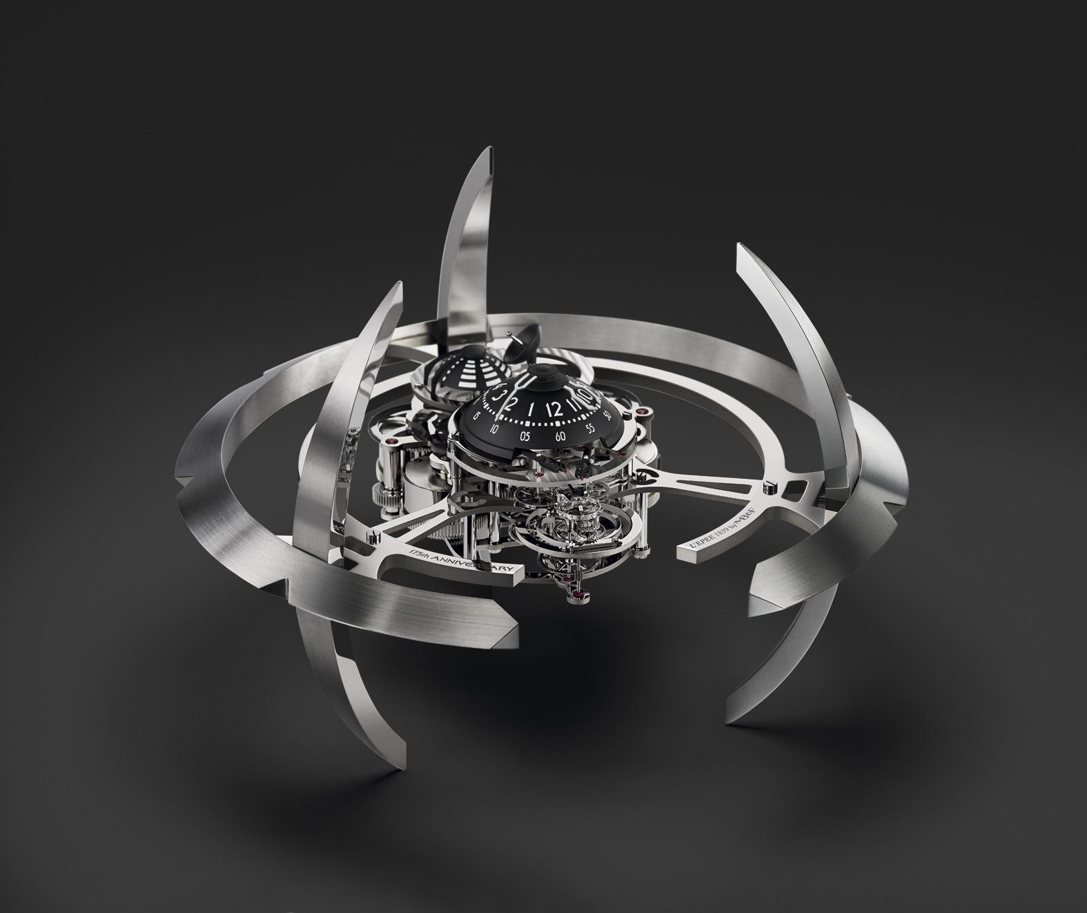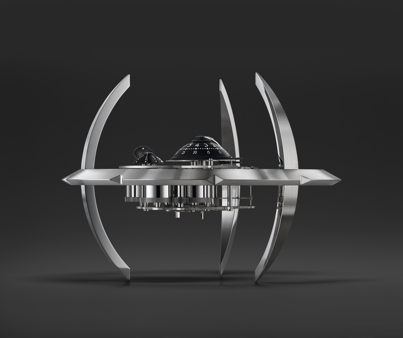 - Segundos retrógrados: se indican intervalos de 20 segundos con cañones dobles volantes y retrógrados que salen del domo central.