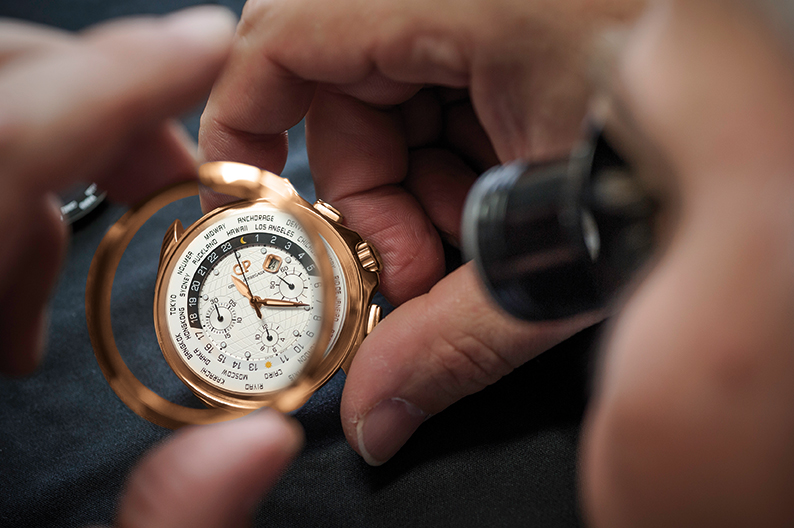 • Funciones : horas, minutos, pequeño segundero, horas del mundo con indicador día/noche, cronógrafo, fecha
