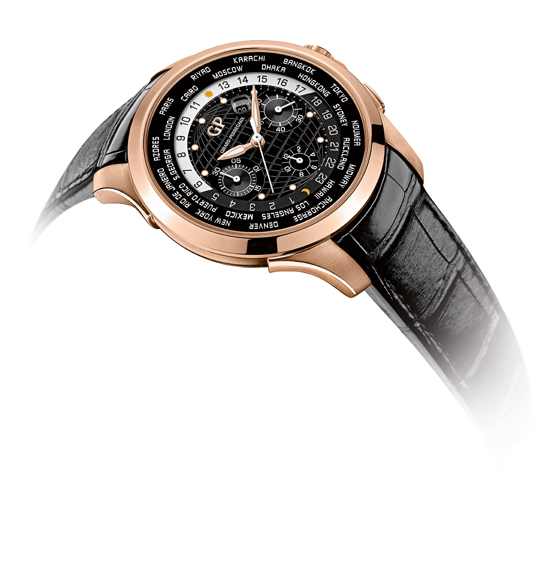 Caja: Oro rosa Diámetro 44 mm Cristal de zafiro antirreflejos Fondo de cristal de zafiro, cerrado por 6 tornillos Hermético hasta 100 metros Esfera: Opalina o negra Fecha a las 1:30 Pequeño segundero a las 3 Contador de 30 minutos a las 9 y de 12 horas a las 6 Segundero del cronógrafo central Disco externo con las horas del mundo e indicador de día y noche Funciones: Horas