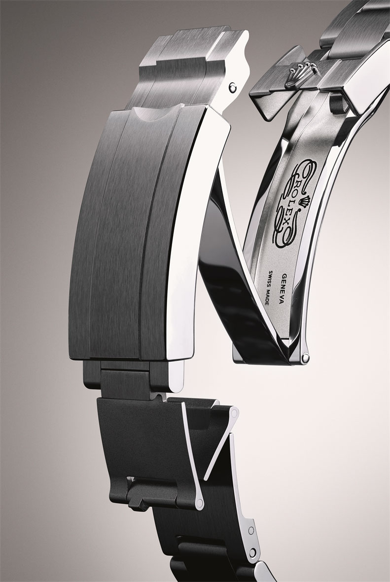 - Brazalete tipo Oyster (3 eslabones macizos). Superaleación de acero inoxidable 904L, eslabones centrales pulidos, eslabones laterales satinados con los cantos pulidos