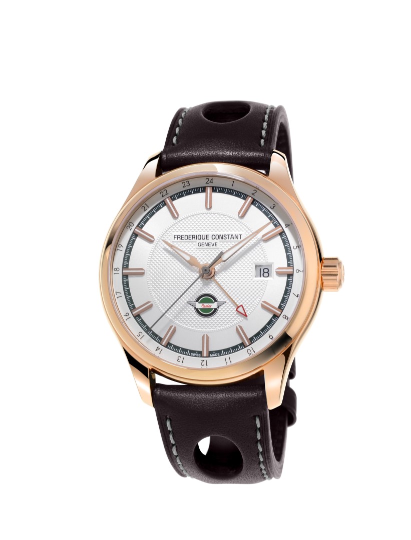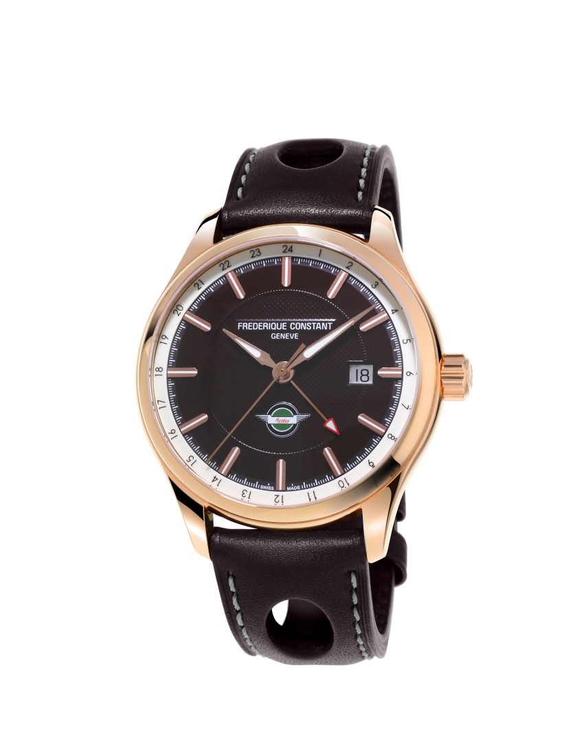 Caja de caja de oro rosa chapado con esfera plateada o chocolate e índices en oro rosa chapado. Correa de cuero marrón