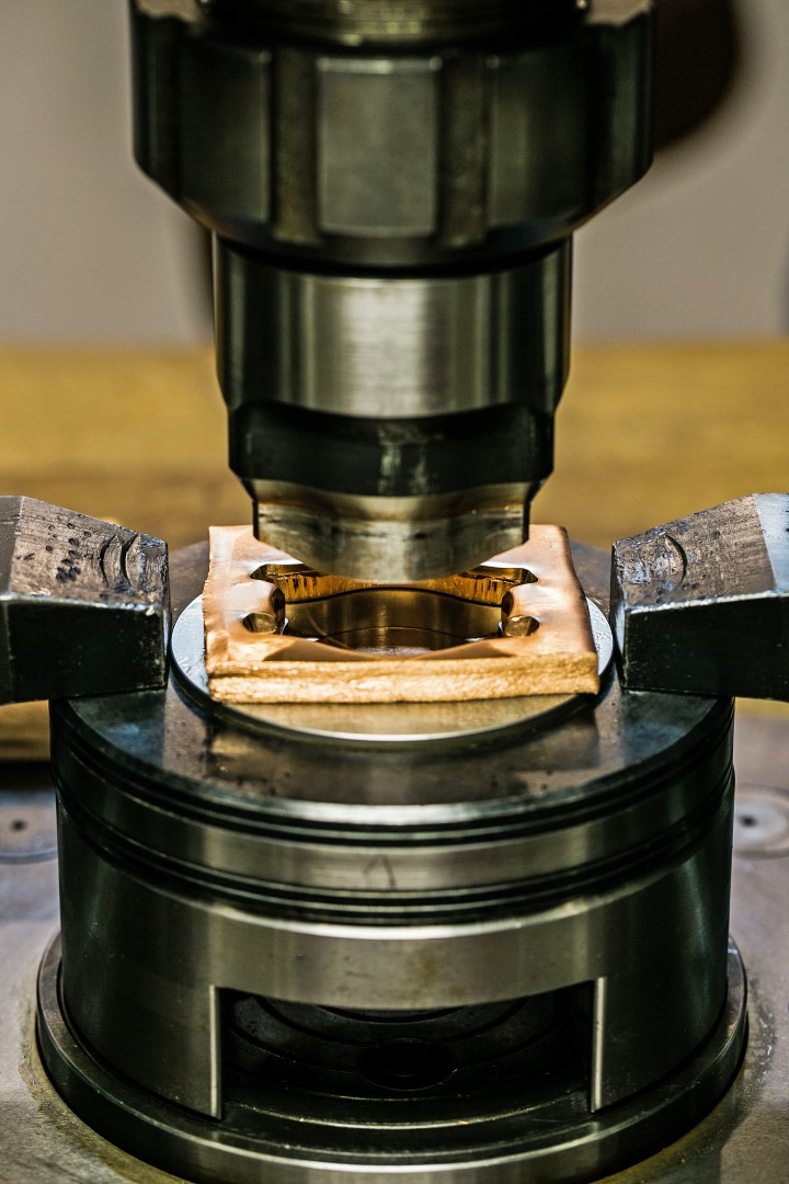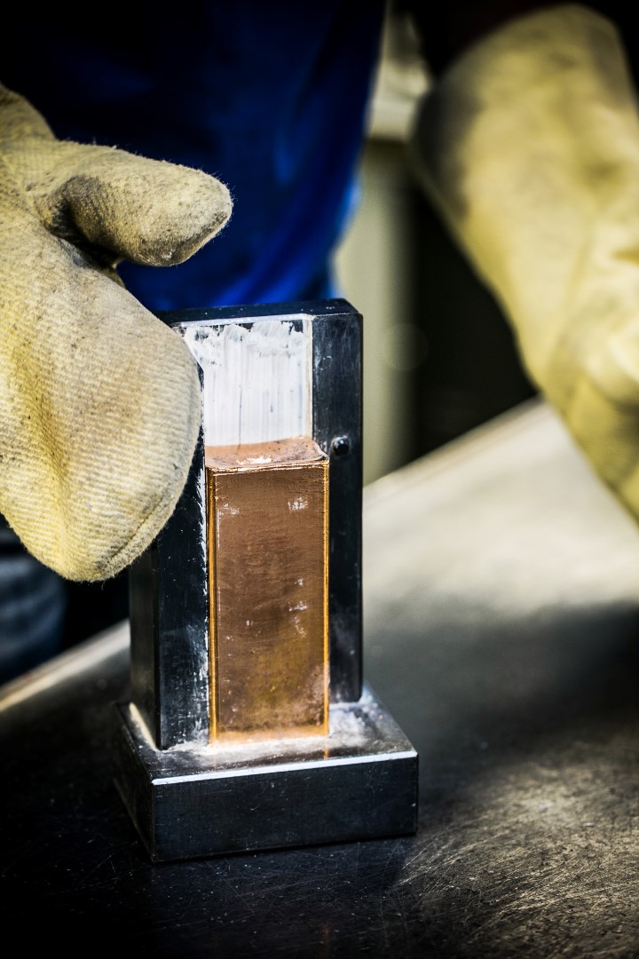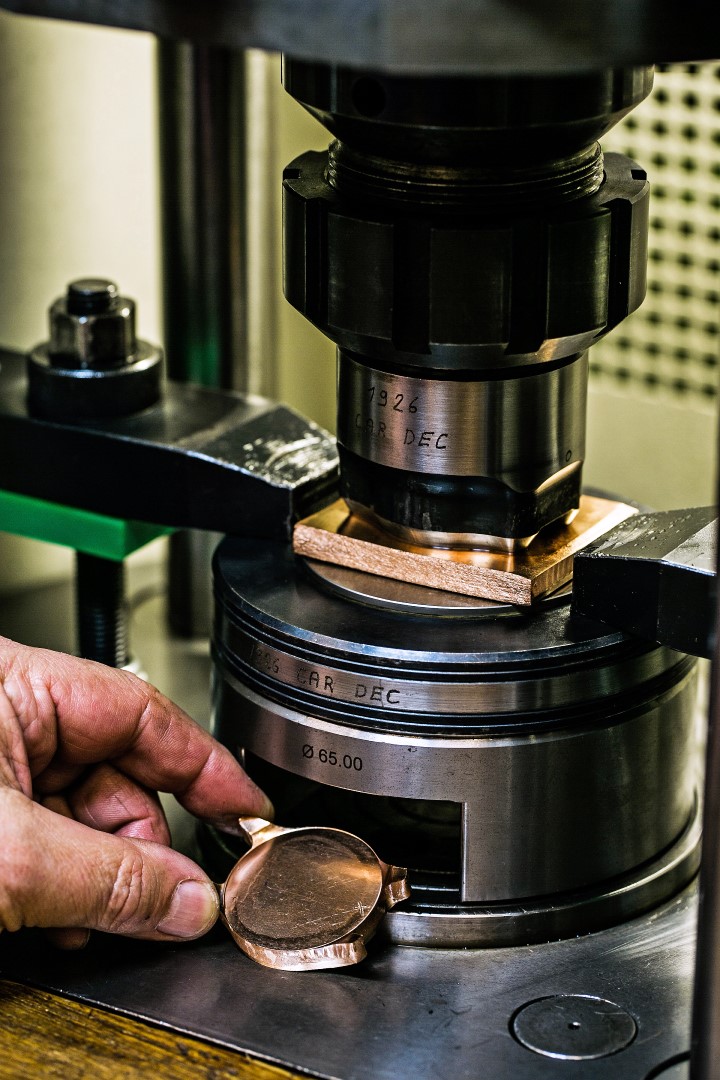 Hay otra sala donde se lleva a cabo un proceso separado, distinto y distintivo: la forja de las cajas de oro de comercio justo (fairmined gold, en su acepción internacional). Chopard está asociada a la Alliance for Responsible Mining desde 2014 (tal como contaba en este artículo) para producir tantos elementos de oro justo como sea posible. El proceso es así: las pepitas oro se funde en un horno para después crear lingotes. Los lingotes, tras ser enfriados y limpiados, se prensan 40 veces para conseguir un lingote más delgado que además hay que certificar. De ahí el lingote pasa al proceso normal utilizado para crear una caja.