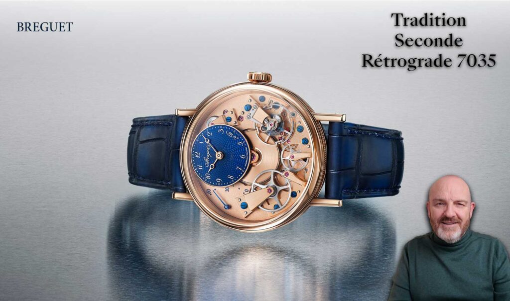 En ese sentido, el Breguet Tradition Seconde Rétrograde 7035 reivindica esa herencia: el tren de engranajes, el barrilete central, los puentes visibles en el frontal, la masa oscilante al dorso… todo pensado para mostrar la mecánica como protagonista.