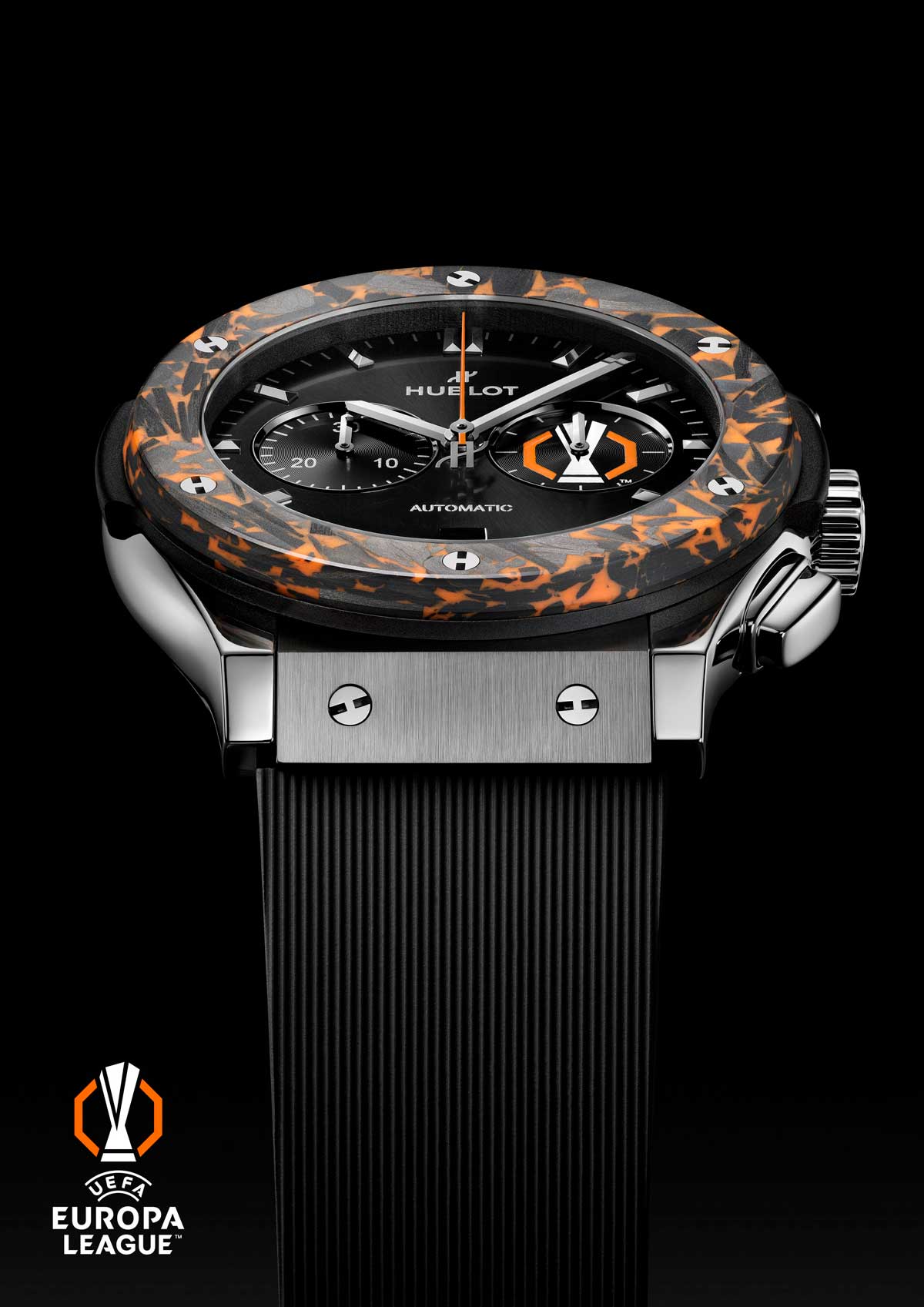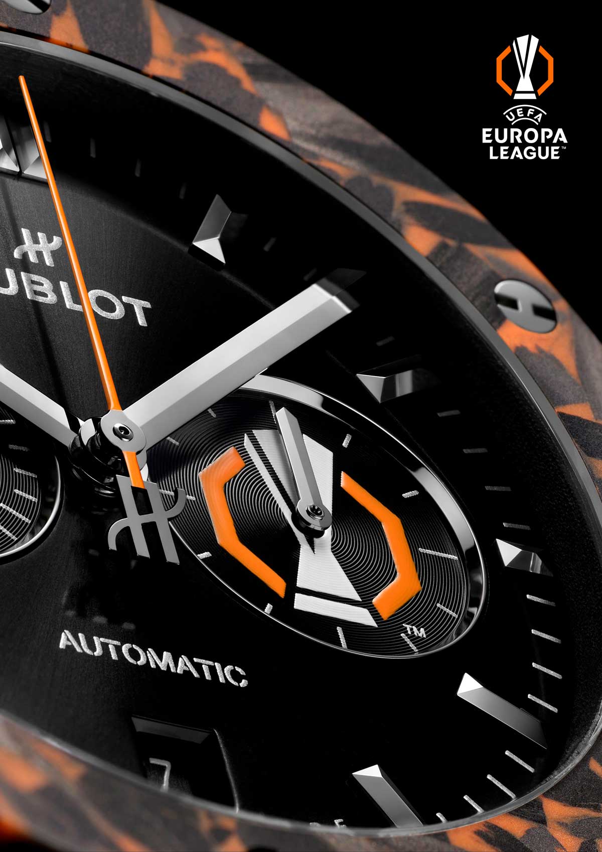 El vínculo entre Hublot y el fútbol se materializa en el Classic Fusion Chronograph UEFA Europa League Titanium Carbon, una edición limitada a 50 ejemplares. Su caja de 42 mm en titanio se combina con un bisel de fibra de carbono con microfibras naranjas, evocando los colores de la competición.